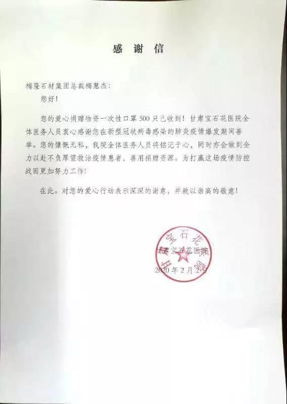 甘肅梅隆石材集團(tuán)有限公司總經(jīng)理梅慧杰正值在北京過年之際,并于大年初一在公司發(fā)起募捐倡議,多方求助親朋好友鼎力相助,歷經(jīng)艱辛努力,購買口罩等醫(yī)用緊缺物資,將..時間捐贈給抗疫一線的相關(guān)單位。公司并向西固區(qū)慈善總會捐贈5萬元人民幣,向西固區(qū)政府、醫(yī)院等部門捐贈外科口罩1000余個等物品,并用消毒物品將公司及周邊每日2-3次消毒。企業(yè)員工團(tuán)結(jié)一心,踴躍參與。
